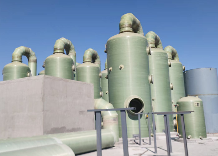 在玻璃钢尾气吸收塔内充填一定高度填料,一般可分成几段填充,两端之间装有液体再分布装置。玻璃钢净化塔按企业逆流操作,混合气体由塔底入口进入,穿过填料层,吸收剂通过流体分布器均匀分布到填料层中,上升气流与下降吸收剂不断接触,到塔顶后达标排放。